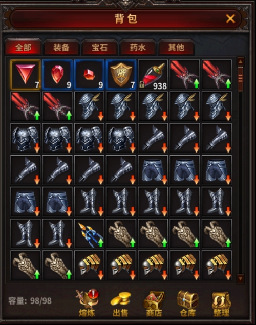 背包内显示了当前拥有的道具,分为“全部”、“装备”、“宝石”、“药水”和“其他”,可以通过点击查看对应分类道具