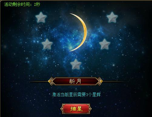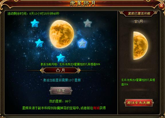 【活动说明】:活动开启时间内,等级≥80级玩家可通过副本和降妖除魔掉落或者商城购买星辉道具,使用星辉点亮星辰,每点亮5个星辰可激活一个月相,激活月相即可获得玄兵神造的BUFF,可提高高星属性在洗练时出现的概率。在此次活动期间内,已激活的BUFF不会重置,在活动完全结束时,BUFF效果会被清除。这是一个洗炼玄兵的好时机,千万不要错过哦!