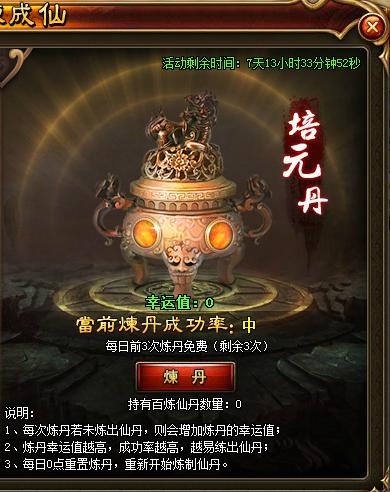 2、活动期间内,玩家可通过消耗道具“百炼仙丹”进行炼丹,如果没有“百炼仙丹”也可以直接消耗元宝来炼丹;