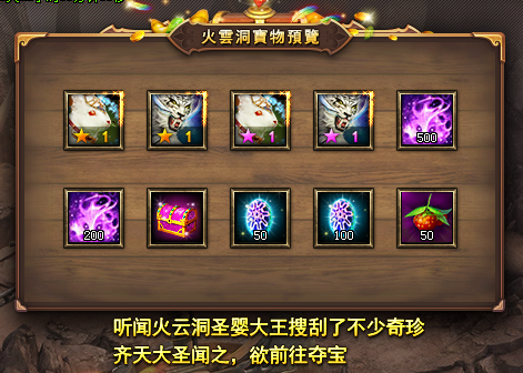 活动说明:活动期间内,主角等级达到60级的玩家可在商城购买火云洞夺宝宝箱