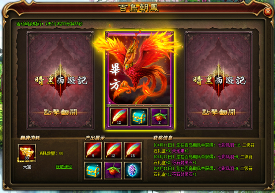 4、百鸟朝凤的奖励会产出大量的七彩凤羽,是培养幻翼的好时机,千万不要错过了!