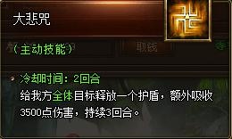 大悲咒可给己方全体目标释放一个护盾,并额外吸收一定伤害。该技能持续时间为3回合,冷却时间为2回合。