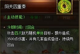 阳关四重奏可攻击4次敌方随机单体目标,额外造成一定伤害,并有几率造成昏迷。该技能持续时间为2回合,冷却时间为2回合。