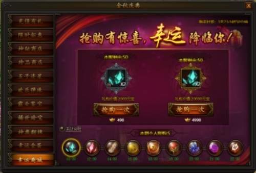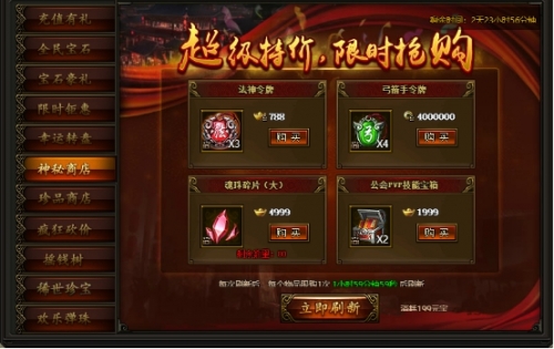 活动期间,每两小时神秘商店会自动刷新一批道具,也可花费元宝立即刷新,大量道具限时等你抢购。