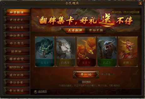 活动期间,每充值一定元宝,可获得一次翻牌机会,抽取一张卡片;集齐各类卡牌,可组合兑换不同档次的奖励。