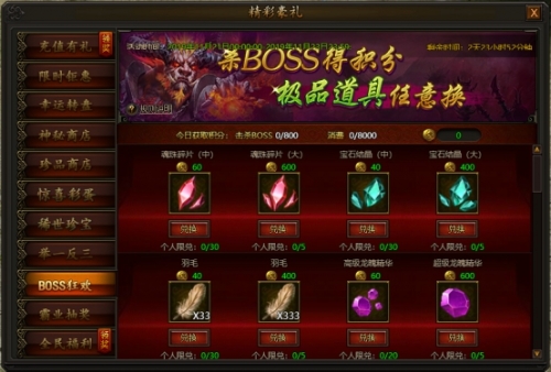 活动期间,击杀野外BOSS及充值可以获得积分,积分可以兑换超值豪礼!