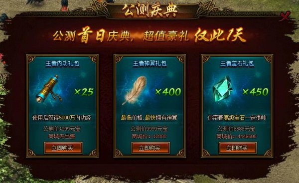 曾有一份珍贵的礼包放在我的面前,我没有珍惜,直到失去了才后悔莫及。现在,小伙伴们不必再纠结错过珍稀礼包了,迎盛世公测,超值礼包横空出世!活动期间,游戏内海量道具限时特惠,绝世礼包惊爆眼球,更有绝版道具开放购买。礼包折扣绝无仅有,仅此一天!各位英雄千万不要错过提升实力的大好机会。