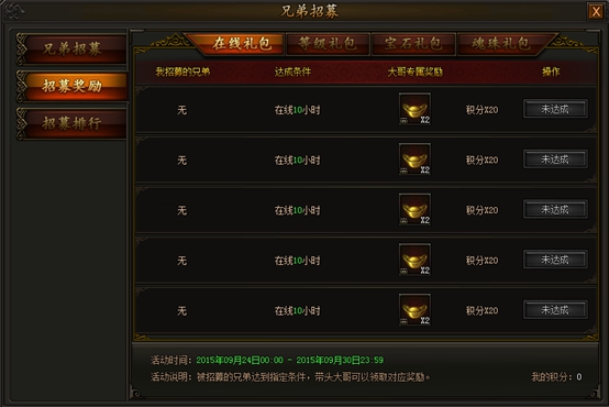 2)成功招募兄弟后,每当兄弟达成目标,大哥均可以获得丰厚的奖励回报。兄弟目标分为在线、等级、宝石、魂珠四类,海量绑元、珍稀材料等待着大哥们去领取,赶快召集兄弟们吧!