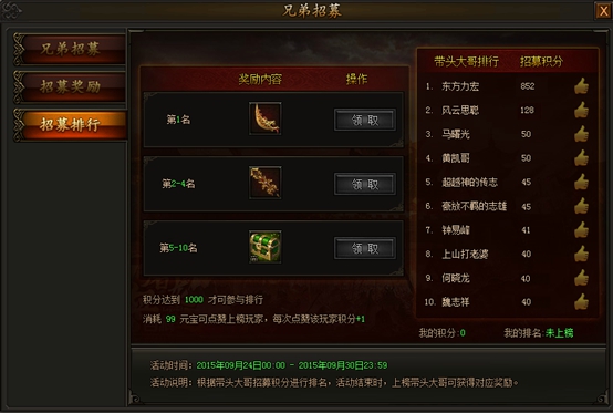 3)除丰厚的目标奖励外,各个带头大哥手下的兄弟达成目标,大哥还可以获得积分奖励,根据积分多少,参与大哥排行,玩家们还可消耗元宝对上榜大哥进行点赞,每次点赞均可给对方增加积分,积分越多,奖励越丰厚!排行活动结束后,大哥们即可领取排名奖励,尽享大哥荣耀!