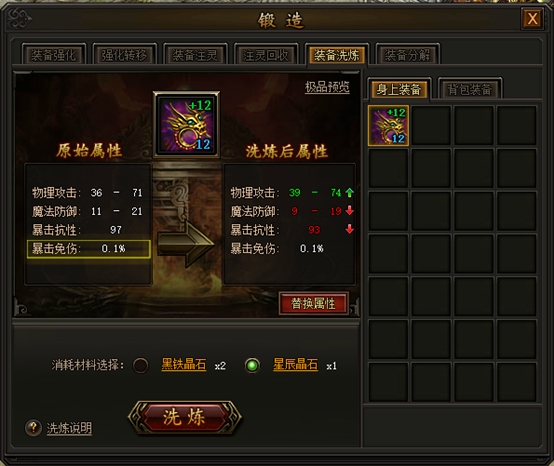 洗练装备转生等级越高,洗练消耗材料越好,就有更高几率获得新属性,点击替换属性即可将洗练后属性附加到装备上;
