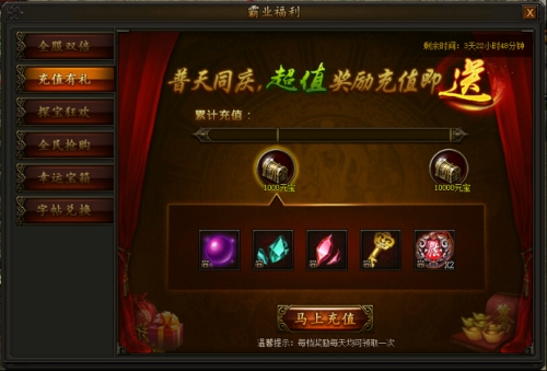 活动期间,充值元宝即可领取两档丰厚奖励,每天均可领取一次,不容错过!
