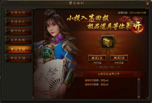 探宝超值回馈限时开启!活动期间探宝可获得祝福值,祝福值达到一定数值即可领取霸业装备奖励!