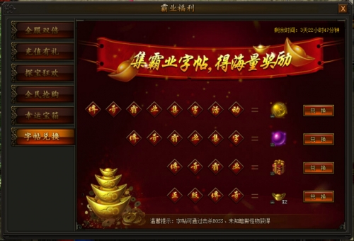 活动期间,击杀Boss、未知暗殿怪物均有几率掉落字帖道具,集齐成套字帖即可领取对应奖励,可多次领取。
