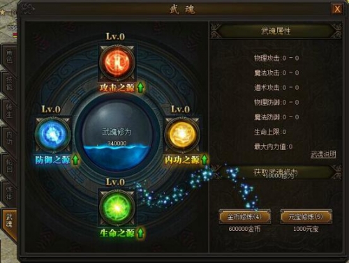 消耗金币或元宝进行修炼,可获得武魂修为,还有一定几率触发暴击;消耗一定数量的武魂修为,可*提升武魂等级,获得对应武魂属性。