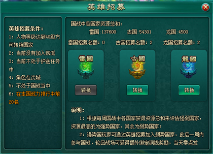 2、英雄招募人数限制:每周每个弱势国家拥有2个转入名额,周日零点更新名额;
