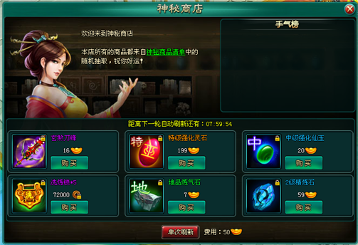 神秘商店也可手动刷新,花费一定的元宝即可刷新一次其中的物品,如果想试试手气,可以尝试下,惊喜不断;