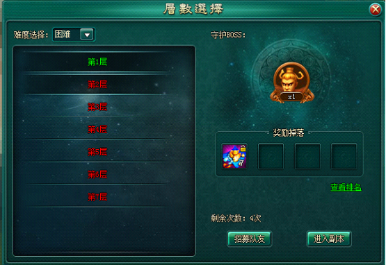 玩家组队后,可选择不同的层来进行挑战,每进入一次消耗一次次数。