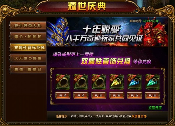 玩家可以通过四个相同部位的单属性首饰兑换相应部位的双属性首饰(元素属性可选择)譬如小明拥有四个单属性戒指,小明最后通过活动兑换可获得一个双属性戒指