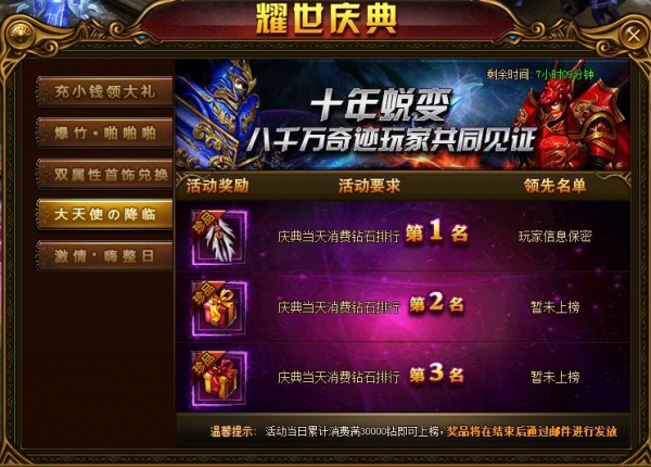 活动范围:活动当天所有100级以上且消费大于或等于30000钻的玩家
