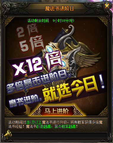 活动期间对2阶及以上的魔法书进行升级,将有概率获得多倍魔法书经验。魔法书阶数越高,暴击概率越高!
