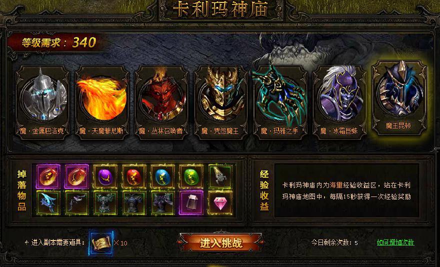 2. 玩家凭借一定数量的道具“失落的地图”可以进入卡利玛神庙,“失落的地图”可以通过道具“昆顿的印记”合成获得(击杀350级以上小怪获得的)