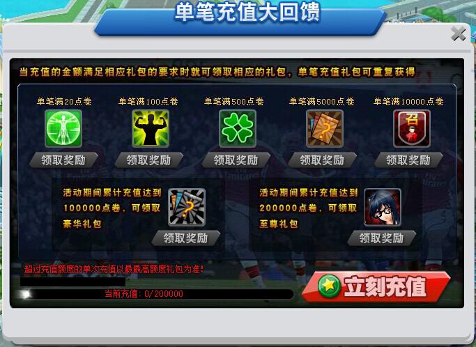 活动期间累积充值达到一定的金额后,可领取巨额礼包。