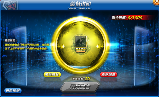 玩家可选择仓库中橙色级别以上的装备进行融合,融合后装备会消失,相应的增加融合进度的点数,玩家可以选择领取当前装备(则点数归零),或累积点数到进度满后,领取一个随机的黄金装备。
