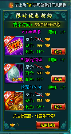 开服第四天后抢购专区里会每天刷新各种折扣道具,甚至有可能刷新免费道具哦!