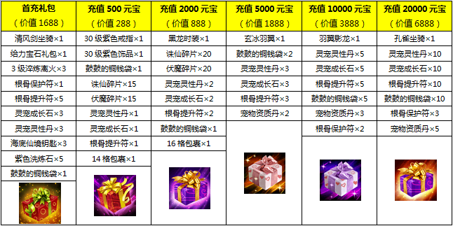 从开服当日起,只要玩家的角色是第一次在游戏里进行充值,不限金额,除了能获得相应的元宝之外,还都将会获得一份“首次充值礼包”。该奖励每位玩家只能获得一次。