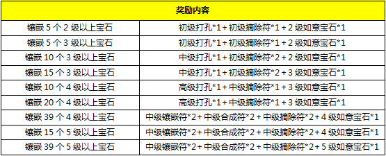 活动内容:镶嵌宝石可以大幅提高玩家战斗力,玩家拥有更多宝石时可以把宝石无损拆除出来合成更高级的宝石。在活动时间内达到指定宝石镶嵌目标的玩家可以获得丰厚奖励。