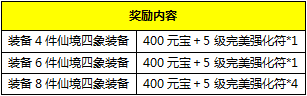 活动内容:活动期间,玩家只需收集并装备仙境一定数量的的紫色防具套装即可获得元宝奖励,达成要求后可在开服活动界面点击领取。