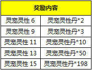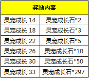 活动内容:提升成长可以大幅提高灵宠属性,成长达到一定数值还能获得额外的属性奖励和灵宠技能空格。在活动时间内达到指定灵宠成长目标的玩家可以获得丰厚奖励。