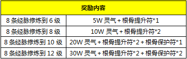活动内容:经脉为玩家前期提高战斗力的捷径,将所有经脉修炼到8级,12级,16级还可以获得额外的属性。经脉配合根骨一起提升可以获得更好的效果。在活动时间内达到指定经脉提升目标的玩家可以获得丰厚奖励。