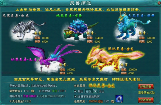 活动内容:活动内容:在活动时间内刷新每天日常的循环任务和灵兽护送任务,即可得到最低为蓝色品质的任务,同时使用多次刷新的时候更能轻易刷出橙色和紫色的任务,完成的任务品质越高,获得的经验奖励越丰厚!