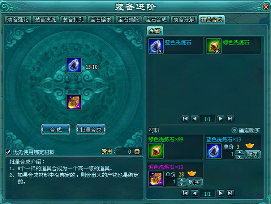 合成的效果是将材料合成更高一级(暂时只开放洗练石合成),成功率100%
