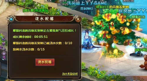 4.玩家可点击洛水城内其他玩家种下的发财树进行浇水祝福,每次浇水后可立即获得1个浇水惊喜礼包,发财树级别不同,获得奖励亦有差异。每人每天浇水上限15次,每次浇水需间隔3分钟;
