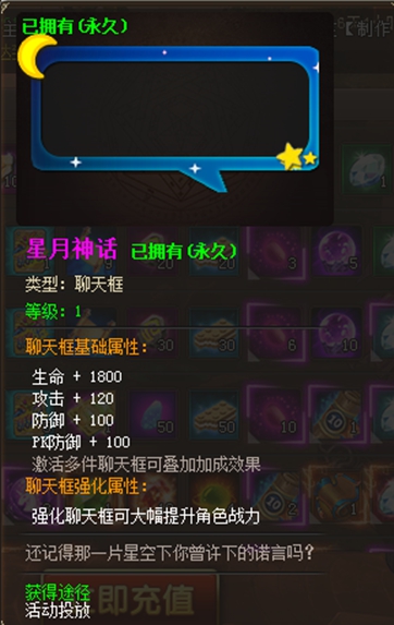 星月神话聊天框(永久)*1、坐骑成长丹*3、神器精炼石*1、图腾精炼石*10、三级护符重置丹*4、+10强化保护符*2、万能宠物卷*1、万能幸运石*1 |