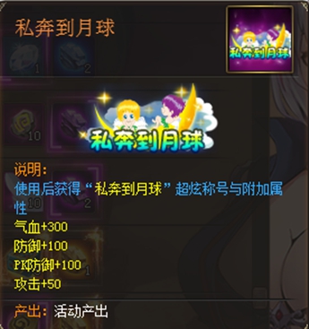 私奔到月球称号(7天)*1、坐骑进阶石*10、三级法宝重置石*1 |