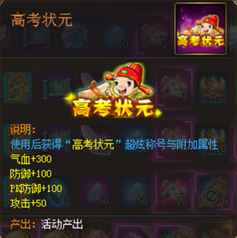 高考状元称号卡(永久)*1、翅膀资质丹*1、坐骑资质丹*1、图腾精炼石*10、三级法宝重置石*4、+10强化保护符*2、万能宠物卷*1、万能幸运石*1 |