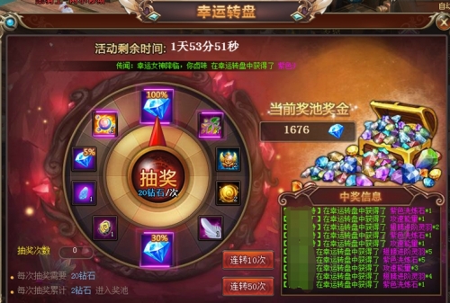活动规则:活动期间,所有玩家有100次限时转盘的机会,100%中奖,所有奖励价值均大于20钻石。更有超级大奖100%奖池钻石!