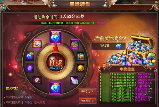 活动规则:活动期间,所有玩家有100次限时转盘的机会,100%中奖,所有奖励价值均大于20钻石。更有超级大奖100%奖池钻石!