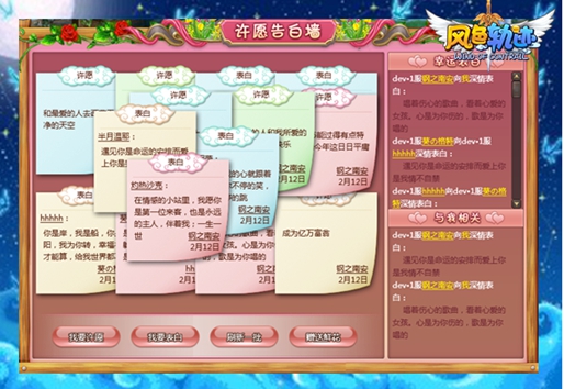 概述:情人节活动期间,玩家可到荣耀之城风振NPC旁的许愿墙进行许愿和表白哦~还等什么,2015脱单从风色开始哦~