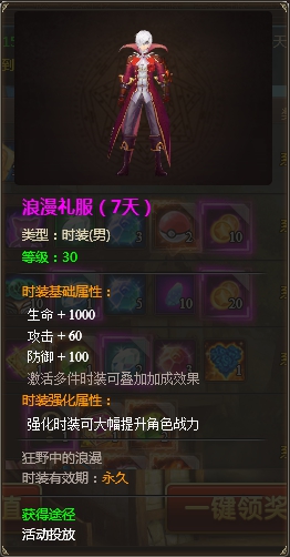 浪漫礼服时装(7天)*1、强化神佑祝福卡*1、神器精炼石*1、优秀幸运石*2、高级强化星钻*3、999朵蓝色妖姬*1 |