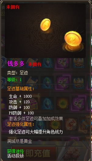 钱多多足迹(永久)*1、翅膀成长丹*2、坐骑成长丹*2、四级宝石之魂*3、三级护符重置石*3、图腾精炼石*10、万能宠物卷*1、万能幸运石*1 |