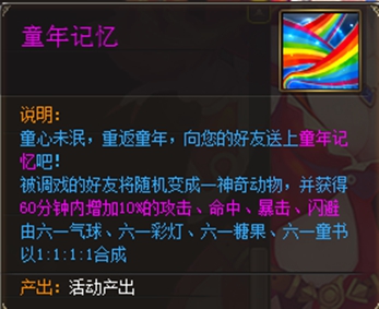 活动规则:活动期间,在塔庙副本将增加掉落六一节道具,达到使用期限后方可使用,使用后可获得时效增益buff。