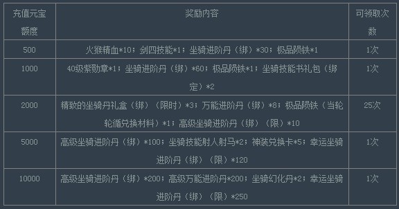 高级坐骑装备箱*1;高级坐骑技能书*2;高级天劫兽灵(绑)(限时)*50 |