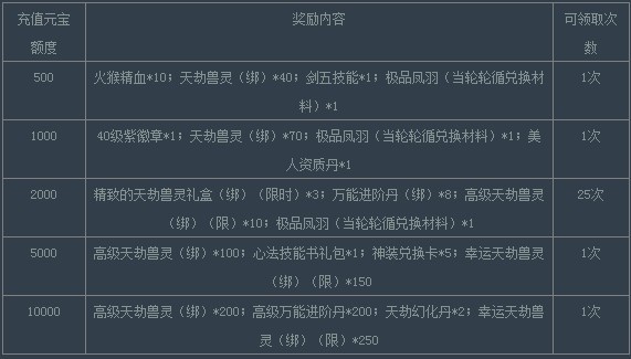 坐骑进阶丹*40;真气5w*4;天劫兽灵(绑)(限时)*10 |