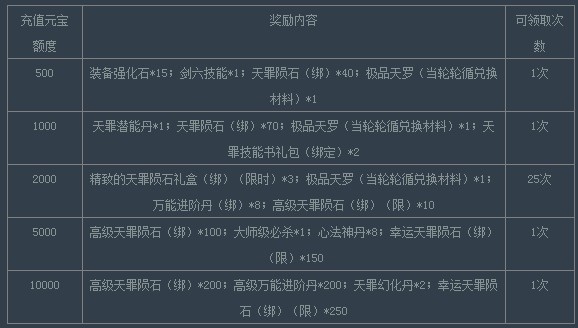 天罪幻化丹*2;高级十方无敌*1;万能进阶丹*300;完美强化符*10;极品天罪技能包*3;幸运天罪兽灵*550 |