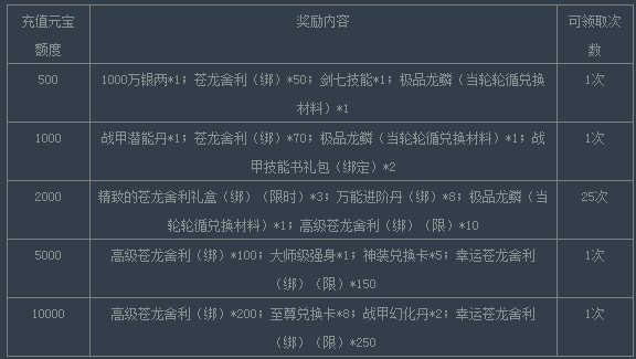 苍龙舍利*40;真气5w*2;万能进阶丹(绑)(限时)*20 |