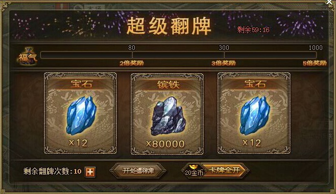2) 福气值累积分别达到80、300、1000时,对应可获得2倍、3倍、5倍翻牌奖励加成!全天有效!